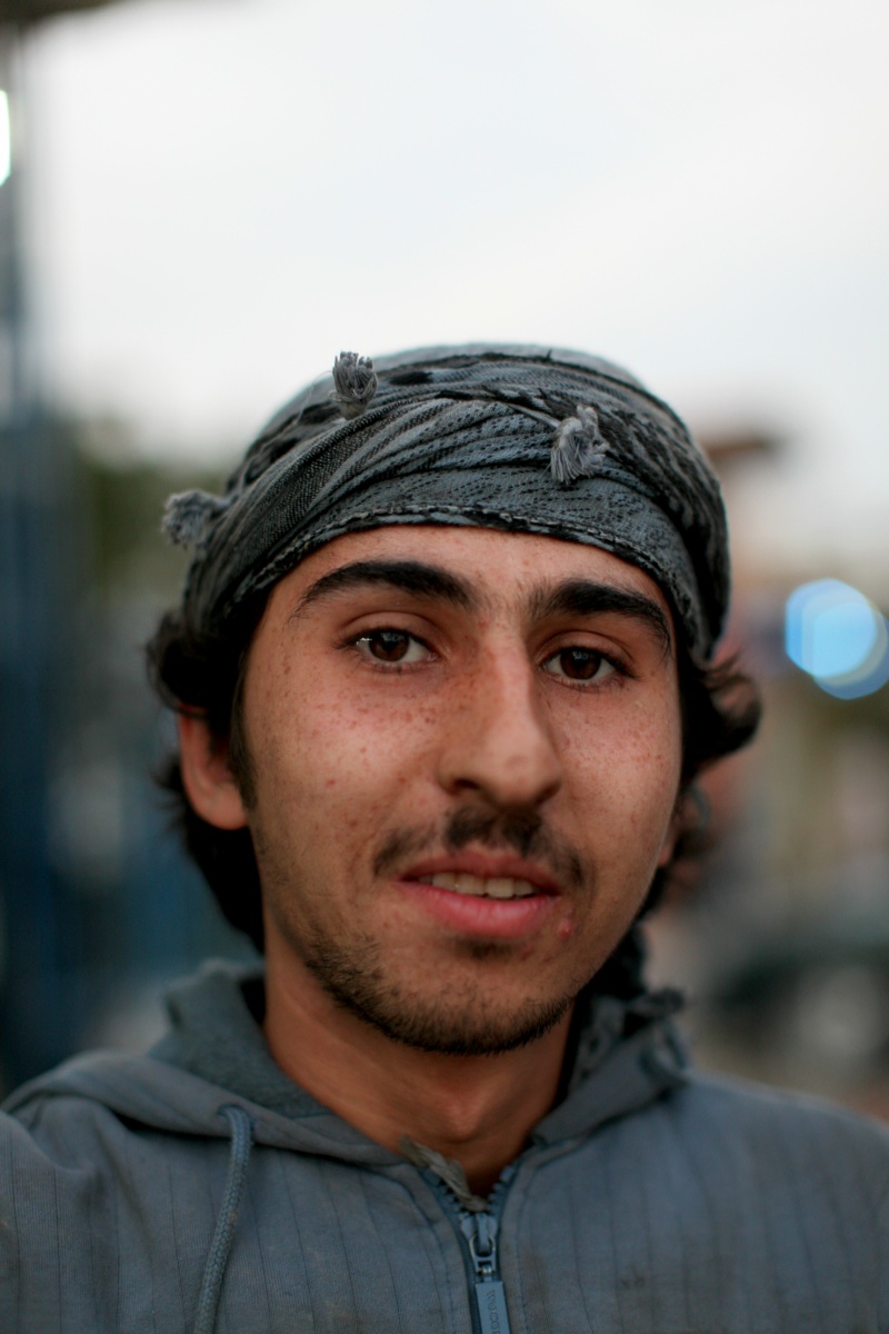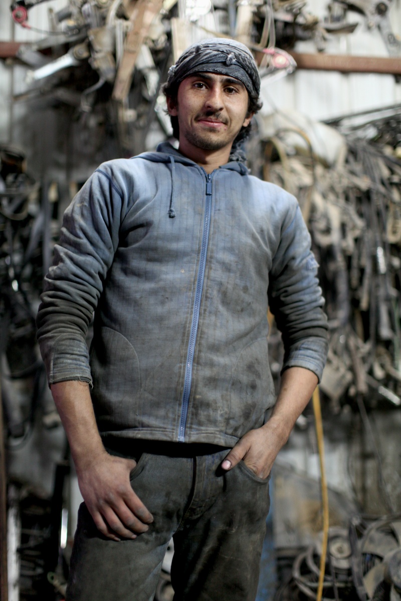 L'homme, encore jeune, est cadré à gauche de l'image. Il porte une écharpe en turban sur la tête et un survêtement bleu un peu délavé. Il regarde Olivier d'un air un peu interrogatif ou simplement sérieux. Une courte barbe noire masque à peine sa peau. Tout l'arrière plan est flou et sombre : on n'arrive pas à deviner quel type de matériaux sont entassés.