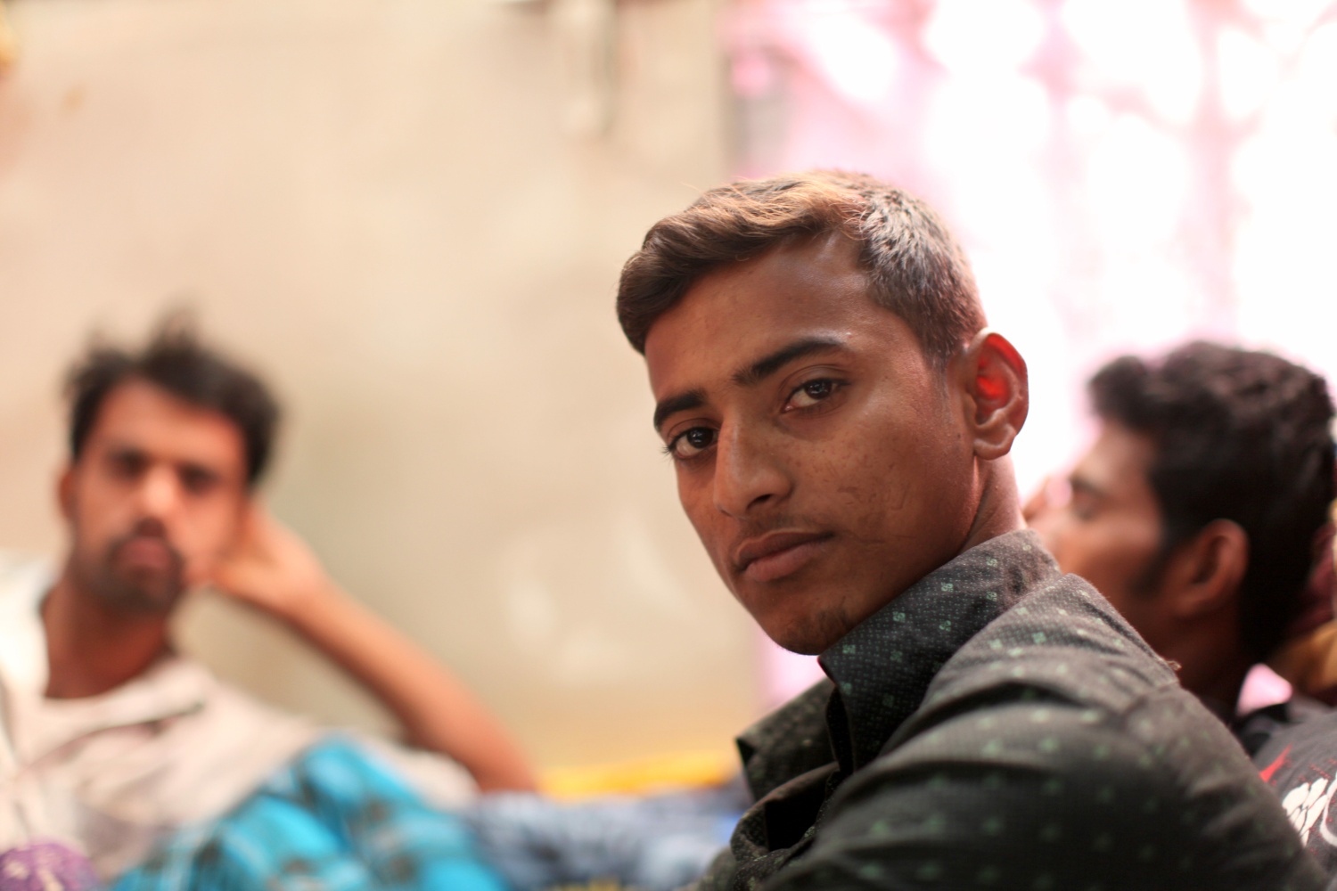 Ce 22 février, en début de matinée, il se dirigea vers les bords d'une rivière dont il photographia les bords et les bateaux. Puis il se dirigea vers une zone d'ateliers où il fit de nombreux portraits. En passant des uns aux autres, il prenait aussi des vues de Dacca ainsi que des personnes qu'il croisait. En milieu de matinée, il passa devant un petit groupe de jeunes gens qui étaient assis probablement aux abords d'une boutique ou d'un atelier. Il les photographia et voici une prise de l'un d'eux.