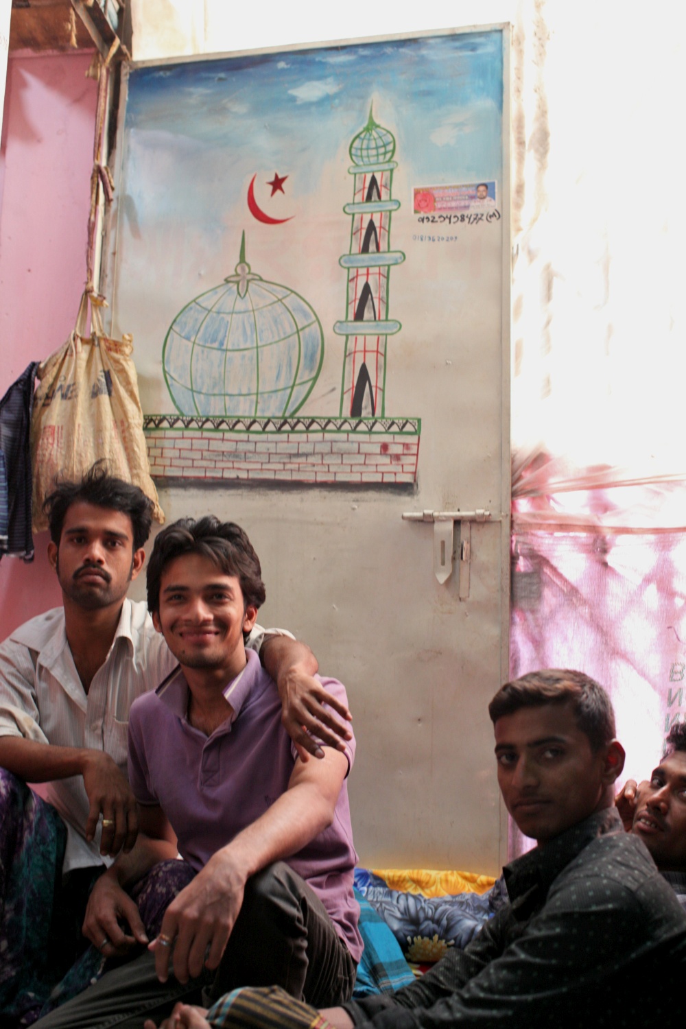 C'est une photographie d'ensemble du petit groupe de quatre personnes. Elles sont toutes quatre assises au sol sur des couvertures. Le jeune homme en chandail mauve sourit très franchement à Olivier, les deux à droite - dont le jeune homme de l'image de la semaine - avec un peu plus de retenue et le jeune homme le plus à gauche est nettement plus réservé : il a passé son bras sur l'épaule de son voisin. Derrière eux, une porte métallique est ouverte : sa face visible - la face intérieure - est peinte avec une représentation naïve d'une mosquée. Un rideau filtre les rayons du soleil.