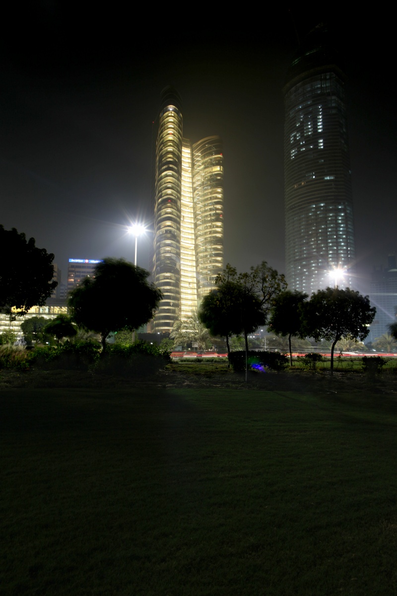 La tour la plus éclairée et la plus originale est à peu près au centre de l'image. L'autre tour, plus à droite, émerge à peine de la nuit, au point que l'on n'est même pas sûr d'en distinguer le sommet. Deux lampadaires éclairent d'une lumière blanche assez violente. Les arbustes du parc se dressent en ombre chinoise dans le halo lumineux produit. Au premier plan, une pelouse occupe plus du tiers inférieur de l'image. Aucune personne n'est visible. Le ciel, sauf en proximité de l'habitat, est dans un noir profond.